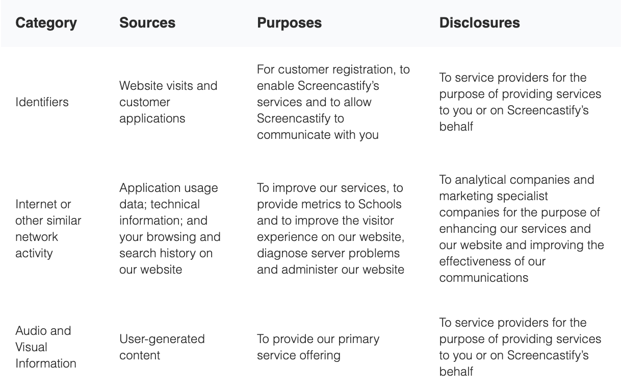 California law grants additional privacy rights to California residents. In particular, businesses must disclose, for the past 12 months, (i) the categories of personal information collected, (ii) the sources of the collected personal information, (iii) the purposes for which the collected personal information is used, (iv) the categories of personal information disclosed for a business purpose, and (v) the categories of any personal information sold. Screencastify provides these disclosures in the following table. (Note that Screencastify does not sell any personal information)